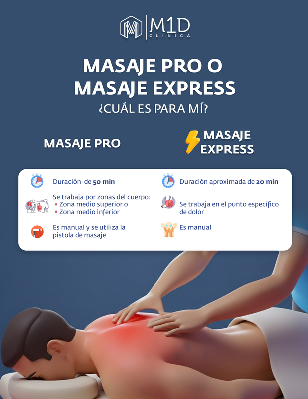 En MID Clínica incorporamos nuestros nuevos servicios Express, pensados para personas con poco tiempo que buscan alivio rápido y atención profesional. Tanto Masaje Express como Fisio Express están dirigidos a quienes presentan molestias leves, tensión muscular o sobrecarga física y desean una solución efectiva en pocos minutos, sin perder la calidad ni la atención especializada que nos distingue. Ideales para agendas ocupadas, sin dejar de cuidar tu bienestar.